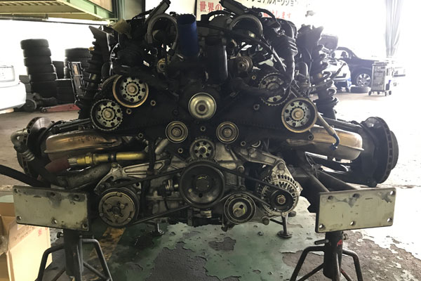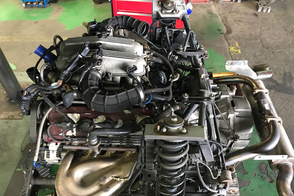 足回りごとエンジンを下ろしてからの作業となります。ベルトとともにベアリング、ウォーターポンプといった部品も合わせて交換です。タイミングベルトの交換時期は他のメーカーと比べると大変早いので、注意が必要です。