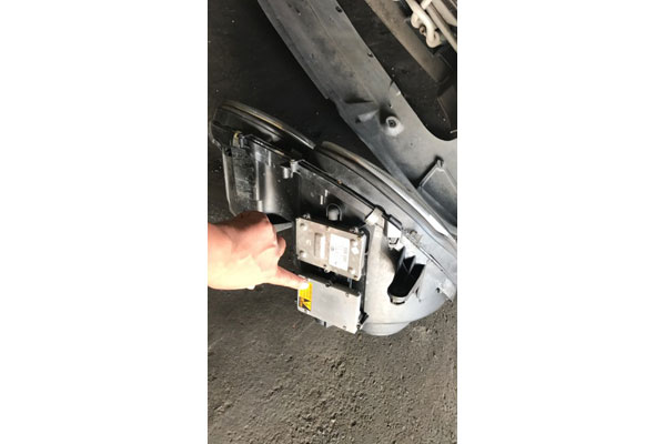今までのヘッドライトは、ハロゲンのバルブが主流でしたが、現在こちらの車両のHID(キセノンといわれるもの)と、LEDのバルブが多くみられるようになりました。見た目では、光の色の違いが分かりやすく、ハロゲンは黄色の様な色で、HIDやLEDは白色となります。HIDではバルブ(電球)の他にバラストと呼ばれる電圧変換機を使っています。高電圧で電極間の放電現象を利用して発光して、明るさはハロゲンの3倍、消費電力はハロゲンの1/2、バルブの寿命は約5倍長持ちと言われています。今回の故障の原因はバラスト(電圧変換機)の不具合でした。こちらの部品を交換して、修理完了です。
