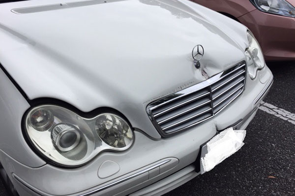 メルセデスベンツ Cクラスの板金修理のご依頼です。ボンネットの凹み切れに関しては修理にすると時間と費用がかかるので、同色の中古ボンネットにて交換のご提案をさせて頂きました。